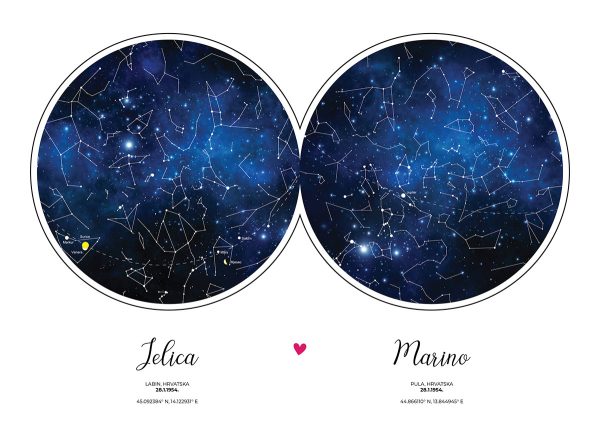 Za vas ćemo napraviti plakat dimenzija 30 x 40 cm, 40 x 50 cm ili 50 x 70 cm s točnom konstelacijom zvijezda te noći kad vam je srce poskočilo.